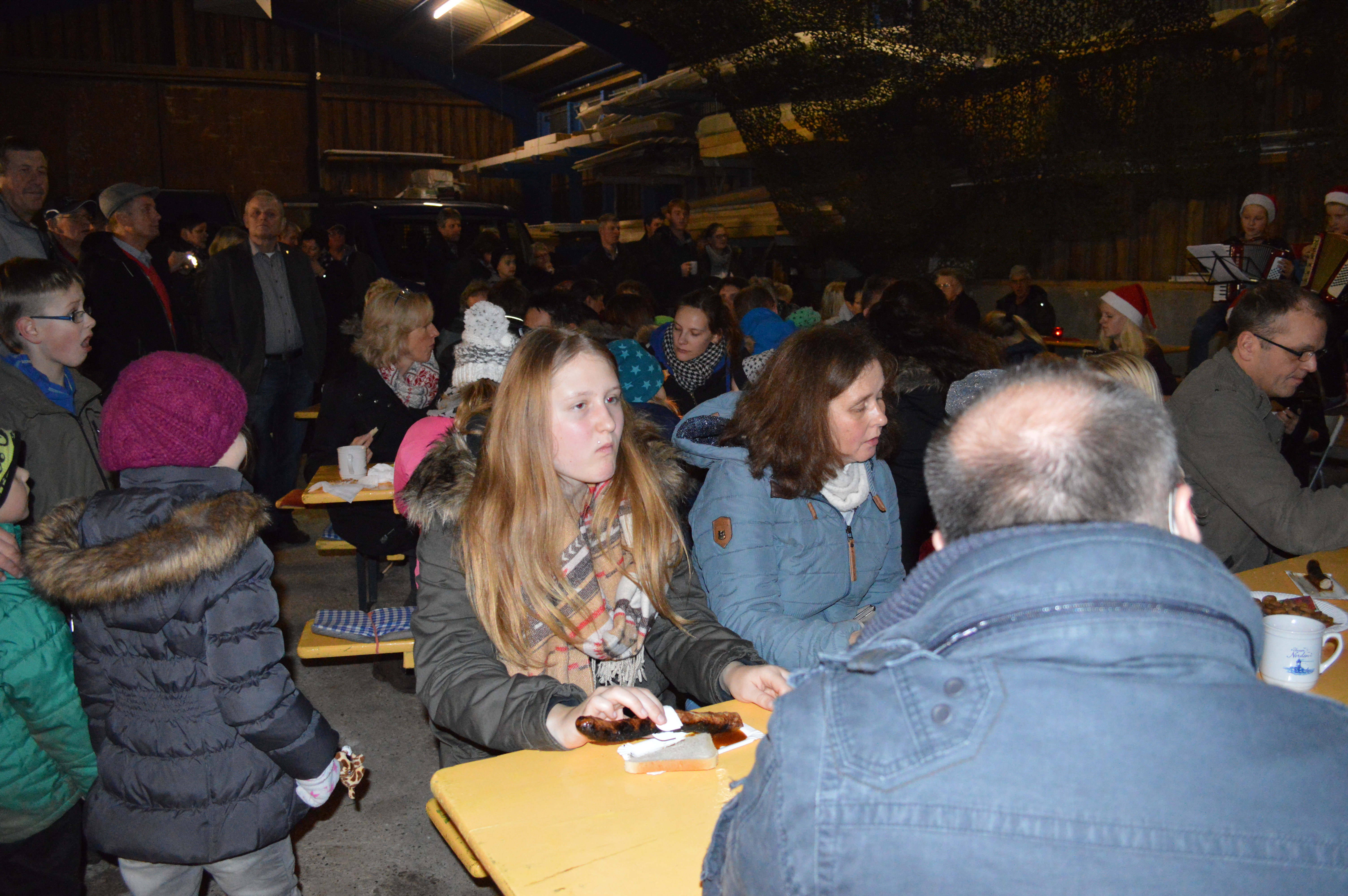Am 18. Dezember konnte dank Förderverein und Landfrauenverein gemeinsam bei Angelika und Hans Clausen (Anniges) in der weihnachtlich hergerichteten Werkstatthalle das Wochenende vor Heiligabend eingeleitet werden. Akkordeonspieler aus Haselund begeisterten mit schönen Advents- und Weihnachtsliedern und sorgten für gute Stimmung. Gestärkt durch Leckereien vom Grill, Keksen und Punsch ging der Abend viel zu schnell vorbei.